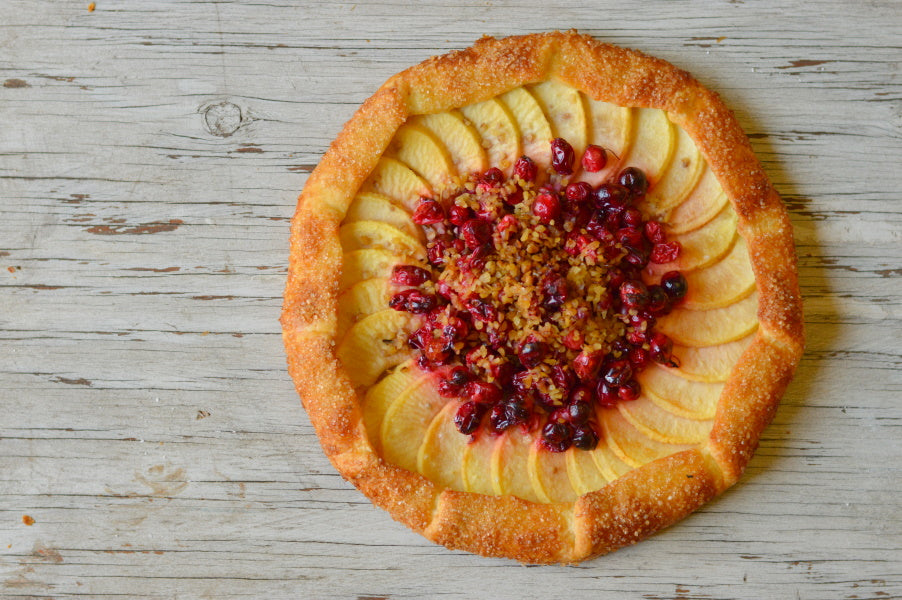 Thinly sliced local apples topped with fresh cranberries and toasted walnuts in beautiful handmade flaky crust.