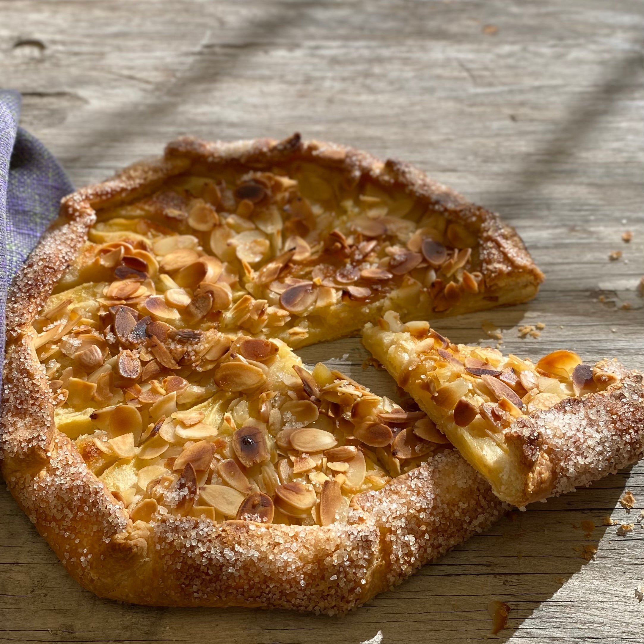 Thinly sliced pears topped with sliced almonds in beautiful handmade flaky crust.